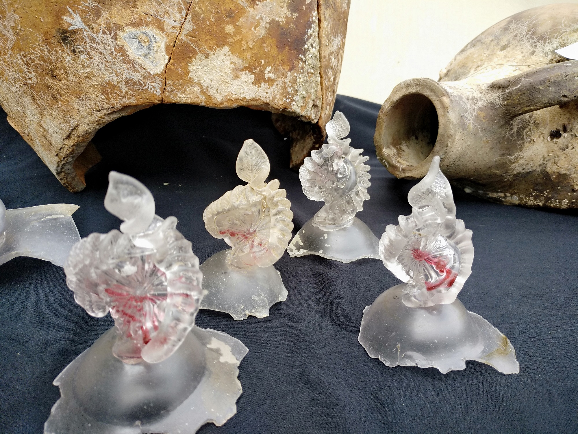 Сред находките от морското дъно са десетки части от стъклени съдове с изключително качество. Няколко от тях бяха показани днес на пресконференция в двора на Етнографския музей. Най-много са чашите за вино. Археолозите не искат да спекулират, но предполагат, че те са произведени през 17 век, вероятно някъде в Италия. Работната хипотеза е, че стъкленото съкровище е пътувало с кораб, който се натъква на подводен риф и потъва близо до нос Чироза. Археолозите са на мнение, че ако проучванията под вода продължат, може да бъде локализиран и самият плавателен съд с още от неговата стока.