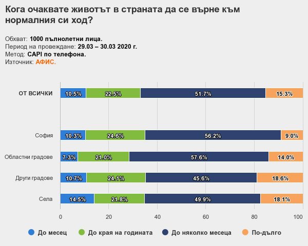 Едва 32% от българите са на мнение, че кризата няма да промени съществено техните доходи. Под 1% са тези, които се надяват в сегашния период да заработят повече от обичайното поради по-голямото натоварване в техния сектор или специалността им (пример са куриерите, медиците, служителите в социалните услуги). А основната маса хора очаква обедняване – от частично („донякъде“ – 37%) до катастрофично („наполовина и повече“ – 31%).