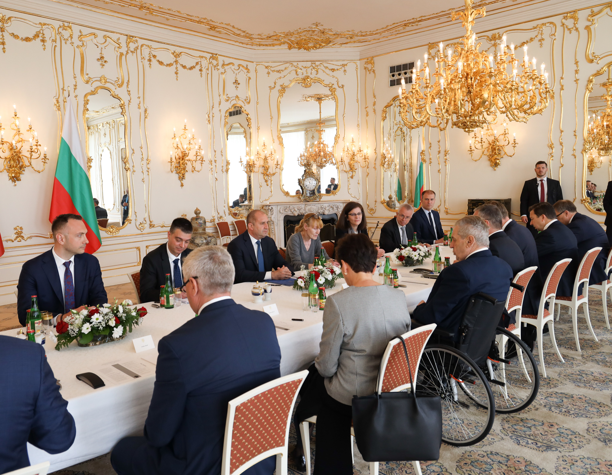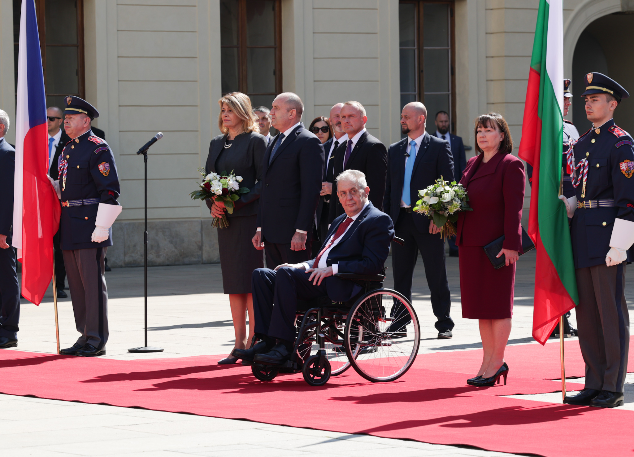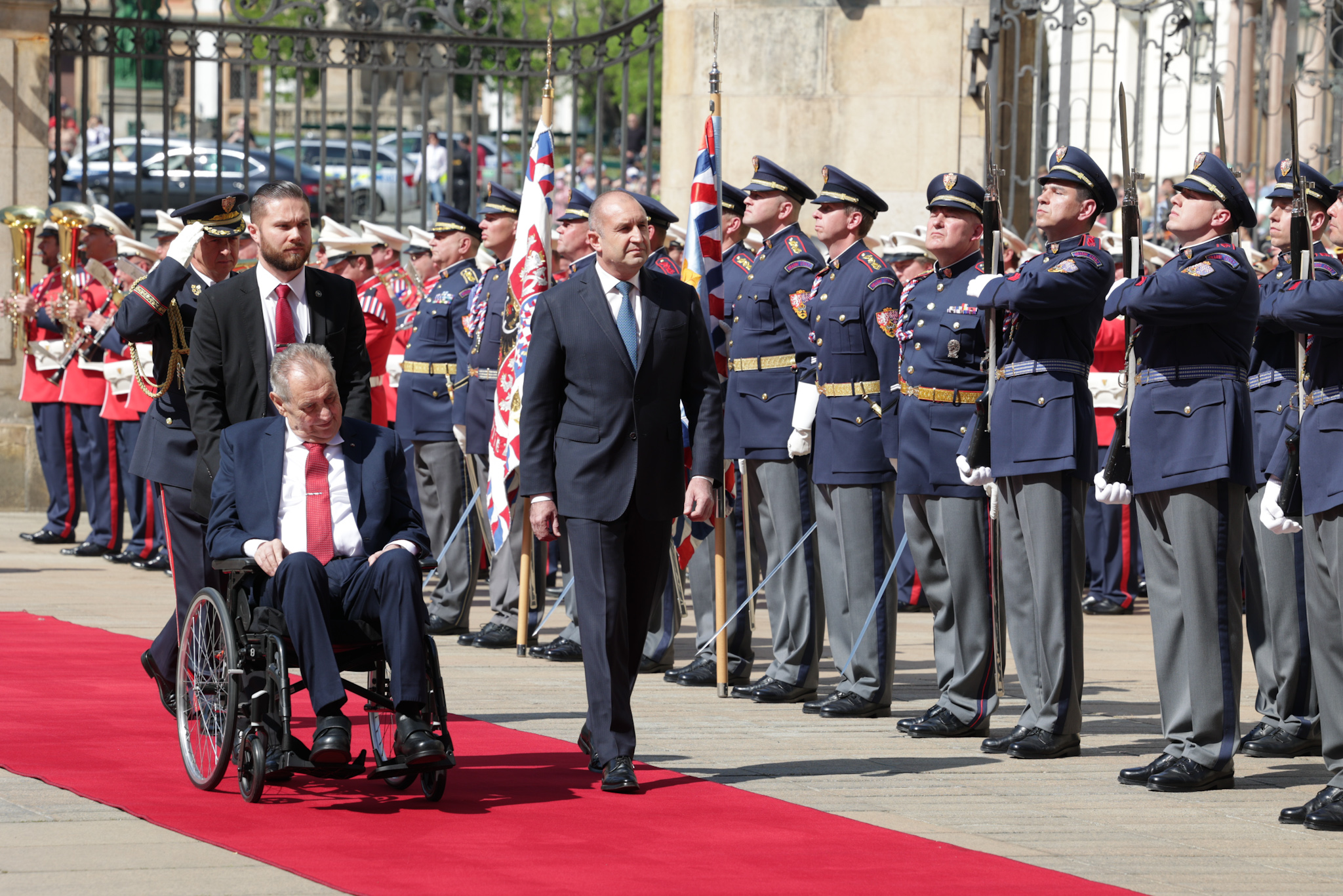 /КРОСС/ Българският държавен глава Румен Радев бе посрещнат от президента на Чехия Милош Земан на гала с военни почести в Пражкия замък Храдчани. Българският държавен глава е на публично посещаване в Чехия по покана на Земан. В делегацията на президента Радев е министърът на външните работи Теодора Генчовска, както и представители на българския бизнес. Двамата президенти ще проведат среща „ на четири очи “, а по-късно ще има пленарни диалози сред делегациите на двете страни.