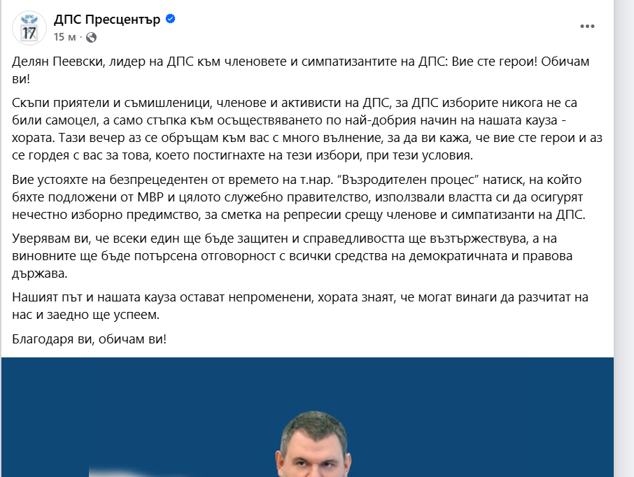 Делян Пеевски, лидер на ДПС към членовете и симпатизантите на ДПС: Вие сте герои! Обичам ви!
