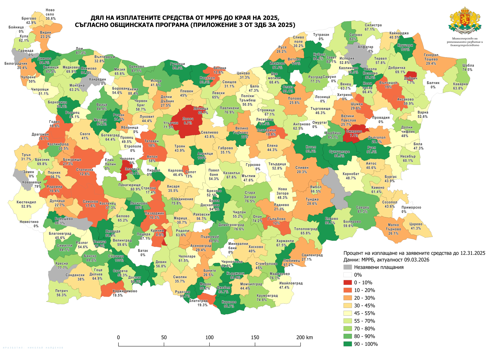 Въз основа на информацията за хода на програмата е изготвена карта с данни по процент на изплатените средства за всяка община до края на 2025 г. Друга карта визуализира процеса по разплащане от началото на 2026 г. Министър Найденов очаква през тази година изпълнението на обектите и плащанията да достигнат 90-100% за всяка община.