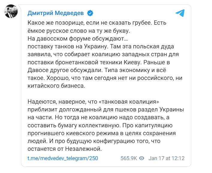 "Какъв позор, меко казано, грубост. На форума в Давос обсъждат... доставката на танкове за Украйна", написа Медведев в своя канал в Telegram.