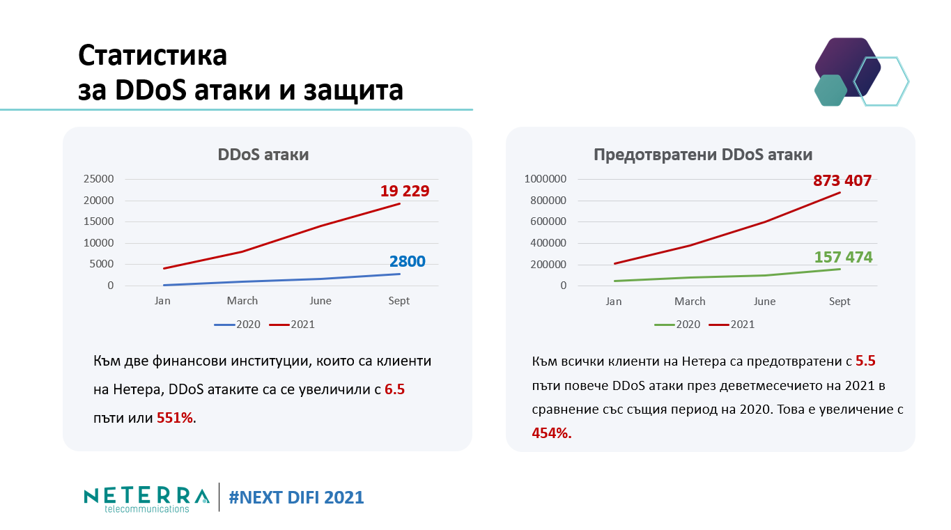 Нетера е предотвратила с 5.5 пъти повече DDoS атаки към своите клиенти през деветмесечието на 2021 година в сравнение със същия период на 2020 г. Това е увеличение с 454%, показват данните от системата за наблюдение на DDoS услугите на компанията. От началото на януари до края на септември 2021 г. Нетера е спряла общо 873 407 атаки към свои клиенти, а през същия период на 2020 г. - 157 474 броя.