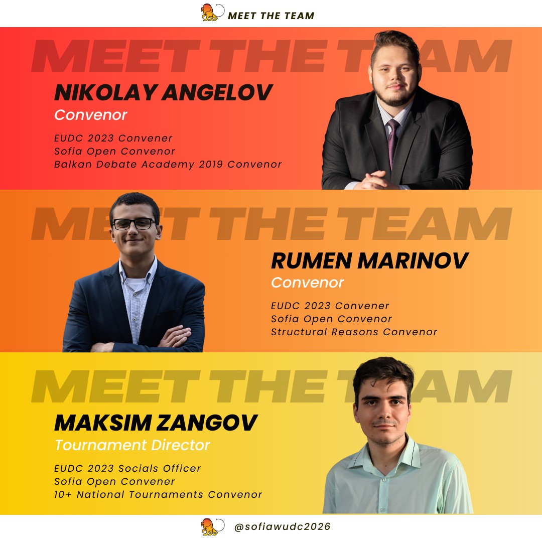 В основата на домакинството стоят личните постижения на нашите състезатели, които прославят страната на Световното първенство в Мадрид, 2023 г. и на Европейското състезание в Бургас през 2023 г., като по този начин печелят възможността да „пренесат" сцената на дебатите в България. Николай Ангелов и Румен Маринов са финалисти на Световното първенство в Мадрид, като Румен е наш алумни студент, завършил „Бизнес икономика". Те, заедно с Максим Зангов, са част от организаторите на Sofia World Universities Debating Championships (WUDC) 2026, което ще се проведе от 27 декември до 3 януари в София, а УНСС ще бъде негов домакин. Събитието има дълга история, провежда се от 1980 г. и е във формат британски парламентарен дебат.