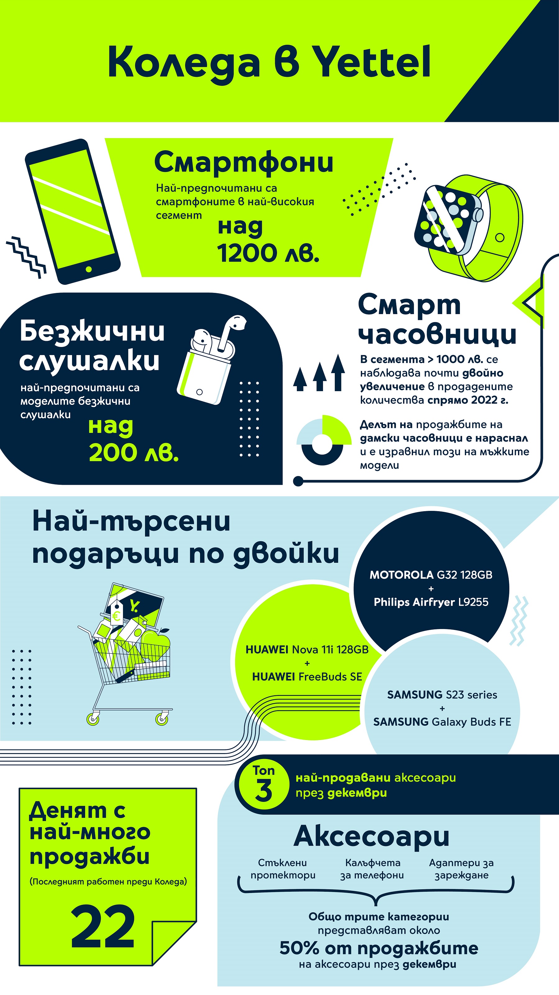Най-високи продажби при телефоните от Yettel регистрират с премиум апаратите над 1200 лв., а при безжичните слушалки най-предпочитани са моделите над 200 лв. Любопитни са данните и при една от най-бързо растящите категории устройства у нас и в глобален мащаб - смарт часовниците. Числата показват, че при най-скъпите часовници - тези над 1000 лв., продажбите този декември са скочили почти два пъти в сравнение с година по-рано. Делът при дамските часовници е нараснал и е изравнил този на мъжките модели.