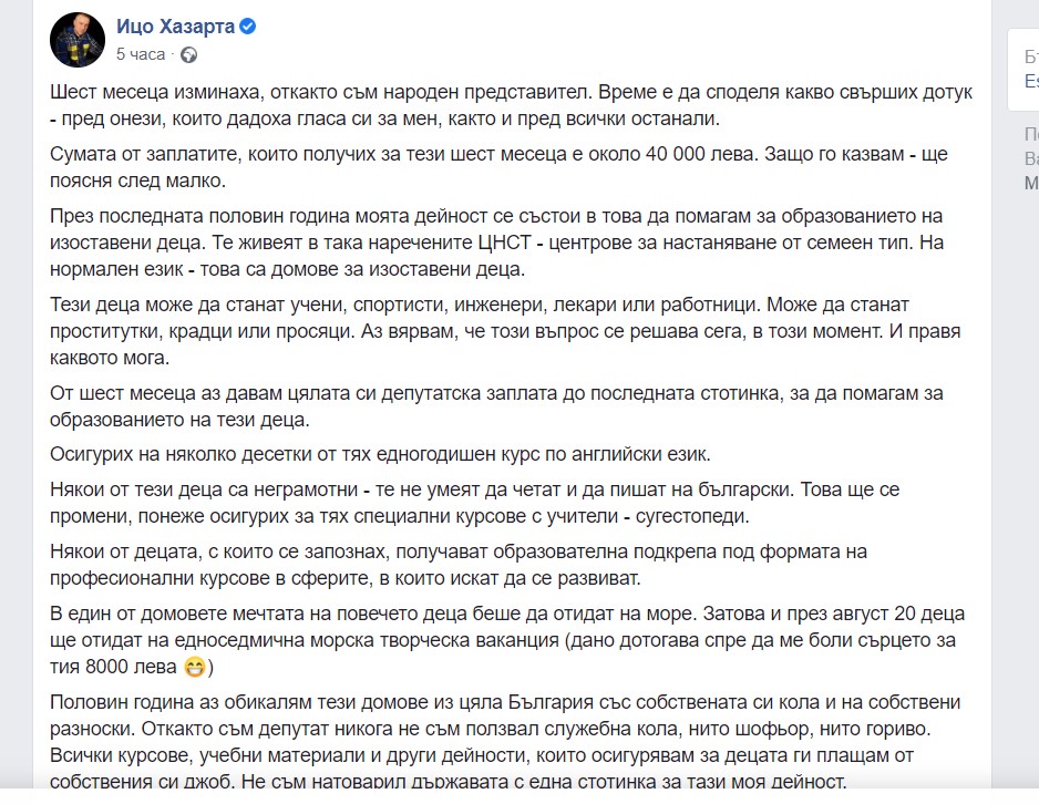 "През последната половин година моята дейност се състои в това да помагам за образованието на изоставени деца. Те живеят в така наречените ЦНСТ - центрове за настаняване от семеен тип. На нормален език - това са домове за изоставени деца. Тези деца може да станат учени, спортисти, инженери, лекари или работници. Може да станат проститутки, крадци или просяци. Аз вярвам, че този въпрос се решава сега, в този момент. И правя каквото мога. От шест месеца аз давам цялата си депутатска заплата до последната стотинка, за да помагам за образованието на тези деца", посочва той.