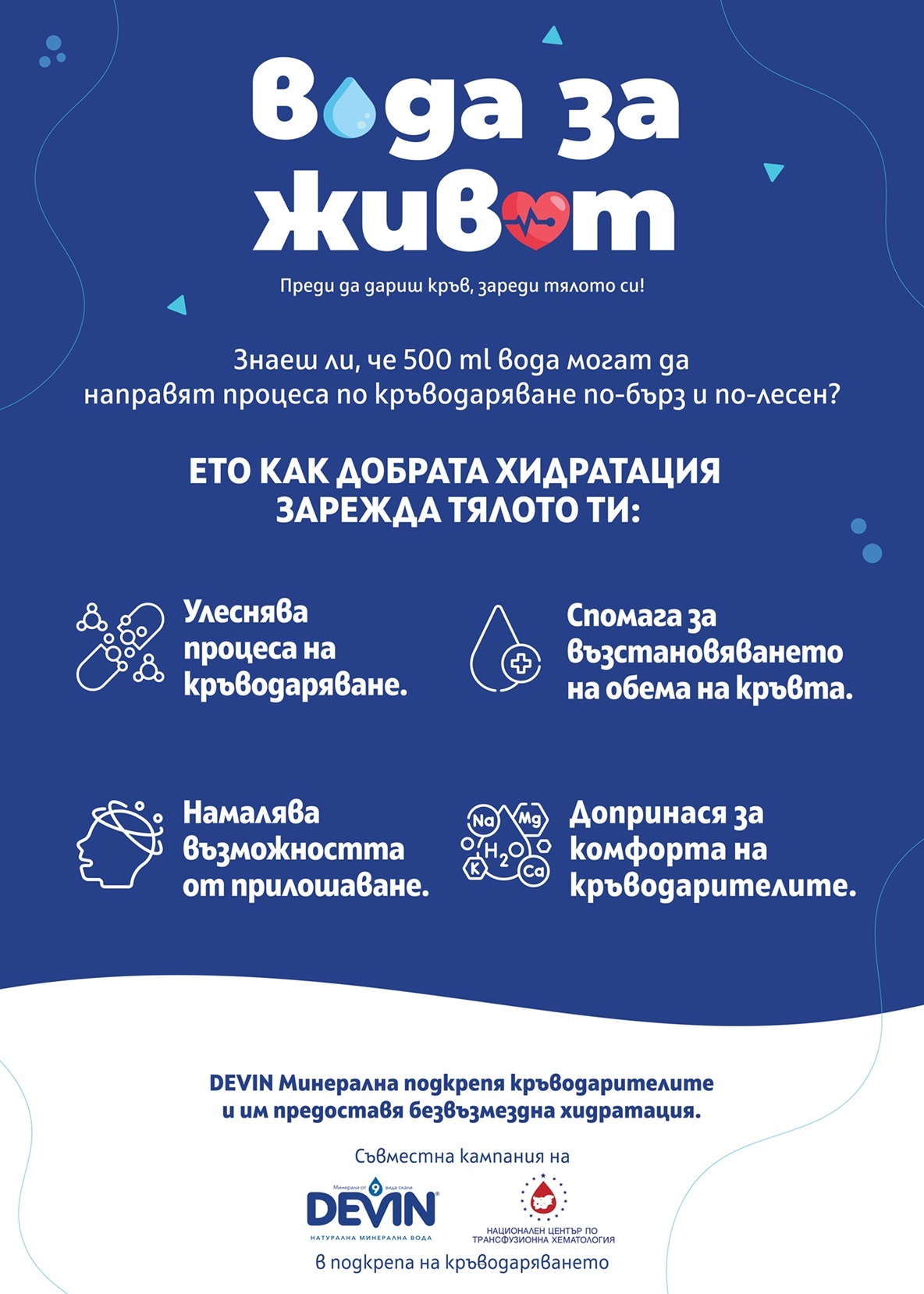 „Със съвместната ни кампания с DEVIN под мотото „Вода за живот" поощряваме хуманния акт на кръводаряването, а в същото време полагаме грижи за здравето на кръводарителите, като подпомагаме тяхната хидратация", посочва д-р Красимира Терзиева, директор на Националния център по трансфузионна хематология (НЦТХ). Тя допълва: „Специалистите твърдят, че приемът на 500 мл вода непосредствено преди да се дари кръв има доказани ползи за тялото. Благодарение на „Девин" ЕАД ще предоставяме необходимите количества здравословна хидратация на тези, които даряват нов живот."