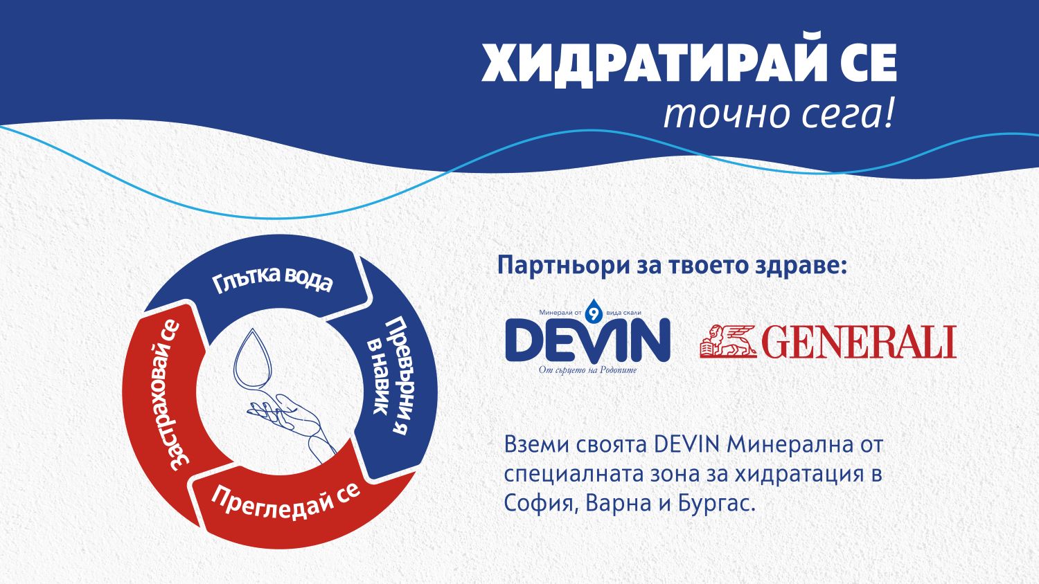 DEVIN, лидер на пазара на минералната и изворната вода у нас, и Дженерали Застраховане, една от водещите застрахователни компании в България, обявиха началото на съвместна национална кампания по повод Световния ден на здравето, 7 април. Под мотото „Хидратирай се точно сега!" съвместната инициатива ще се реализира в рамките на един месец едновременно в 9 медицински центъра в три града - София, Варна и Бургас. Целта - с настъпването на пролетта да се постави акцент върху ролята на пълноценната хидратация и грижата за здравето чрез редовна профилактика.