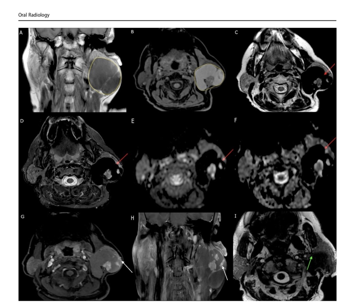 Образните изследвания - компютърна томография и мултипараметрична магнитнорезонансна томография разкриват характерни особености на тумора. На MRI се установява специфична комбинация от находки: силно понижен сигнал на определени последователности („signal void"), повишен сигнал на T1-претеглени изображения и минимално контрастно усилване на кистозните части на лезията, като усилване се наблюдава основно в папиларните структури. При двата случая е установено изместване, но не и инфилтрация на лицевия нерв - ключова информация за безопасното хирургично лечение.