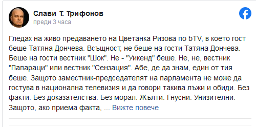 "Заместник-председателят на парламента не може да гостува в национална телевизия и да говори такива лъжи и обиди. Без факти. Без доказателства. Без морал. Жълти. Гнусни. Унизителни. Защото, ако приема факта, че не жълт вестник, а заместник-председателят на парламента говори по подобен начин, трябва да приема, че ние сме избрали жълт вестник за заместник-председател на парламента".