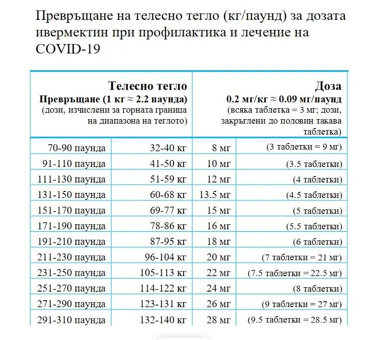 *Пример за човек, тежащ 60 кг (телесно тегло): 60 кг × 0,2 мг = 12 мг - моля вижте таблицата за превръщане, за да изчислите подходящата доза ивермектин.
