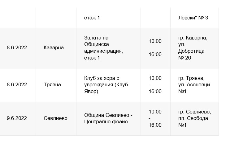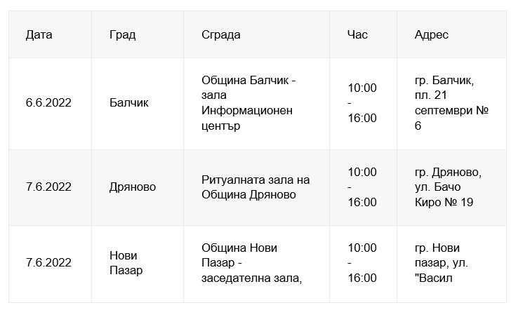 /КРОСС/ В периода от 6 до 9 юни 2022 г. екипи от специалисти „Обслужване на клиенти“ на ЕНЕРГО-ПРО консултират клиенти в населените места Балчик, Дряново, Нови пазар, Каварна, Трявна и Севлиево. Кампанията се организира регулярно с цел да се предложи на потребителите в малки населени места на територията на Североизточна България улеснен достъп до различни услуги, свързани с дейността на компанията. Особено полезни са изнесените приемни за по-възрастните хора, които по-трудно могат да пътуват до областните градове, където са Центровете за обслужване на клиенти на ЕНЕРГО-ПРО.