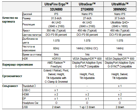 Проектирани да разширят усещането за потапяне в играта за геймърите, моделите UltraGear 34GN850 и 38GN950 разполагат с големи Ims дисплеи с 1 мс и честота на опресняване от 160Hz. За още по-велико гейминг изживяване, моделите 27GN950 и 400 38GN950 са сертифицирани с VESA дисплейHDRTM 600, докато 34GN850 поддържа VESA дисплейHDR 400. И двата монитора разполагат с подобрена стойка, която не само изглежда елегантна, но е и по-здрава и по-стабилна.
