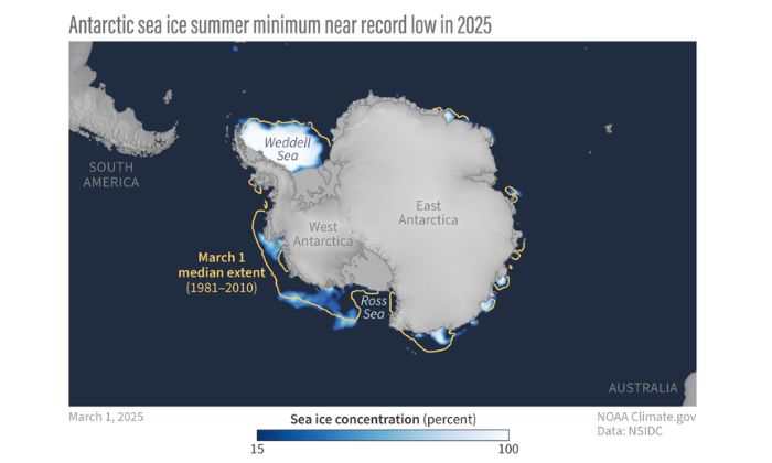 В Антарктика морският лед също остава на изключително ниски нива - регистрирано е едно от най-ниските минимални разширения, а последните години се нареждат сред най-слабите в цялата сателитна история.