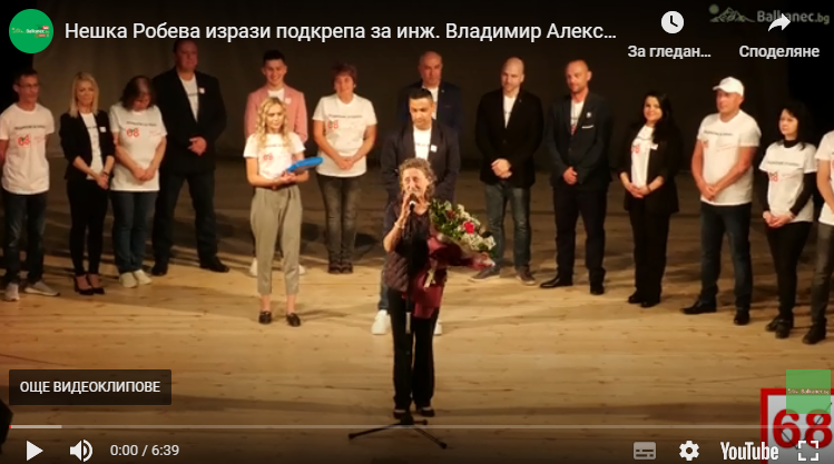 която заяви: „...Мисля, че ние малко се възползваме от природните дадености, които имаме за туризъм. И ето Влади иска да прави туризъм, но най напред иска да направи първо пречиствателна станция. А водата става огромен проблем в целия свят. Имайте предвид, и друг голям проблем - задава се една огромна рецесия, която ще дойде при нас. Фактът, че Влади е поставил за своя цел запазването на работните места. Това е огромна привилегия пред вас.... Аз нямам какво да агитирам.