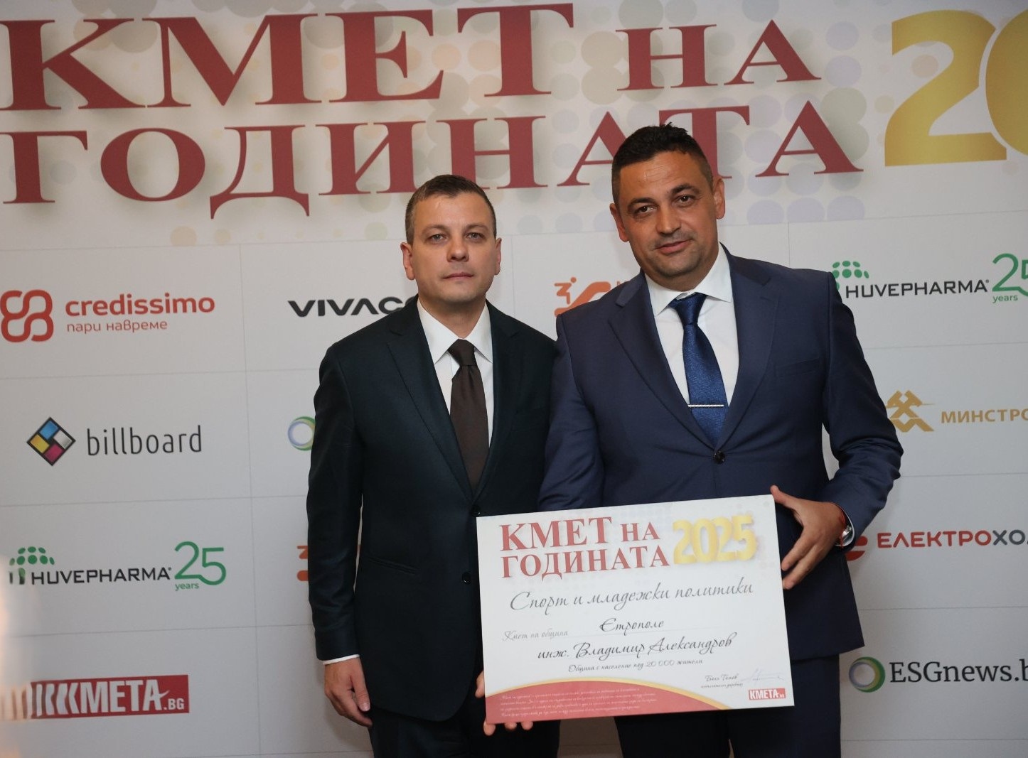 /КРОСС/ Кметът на Община Етрополе инж. Владимир Александров получи престижното отличие „Спорт и младежки политики" в националния конкурс „Кмет на годината 2025 г." Наградата му беше връчена лично от ректора на Националната спортна академия проф. Красимир Петков.