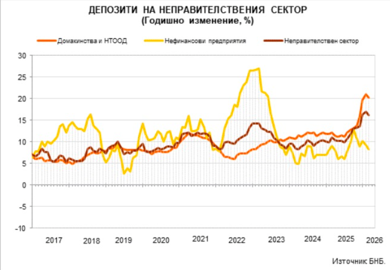 Депозитите на нефинансовия сектор достигат 26,02 млрд. евро в края на февруари 2026 година, като в сравнение със същия месец на 2025 г. те се увеличават с 8,3 на сто, след 9,2% годишно повишение през януари 2026 г.