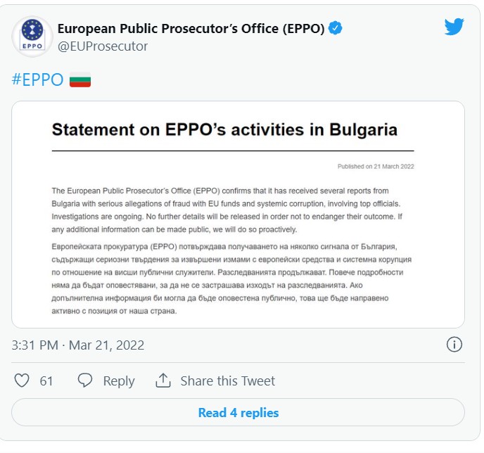 "Разследванията продължават. Повече подробности няма да бъдат оповестявани, за да не се застрашава изходът на разследванията. Ако допълнителна информация би могла да бъде оповестена публично, това ще бъде направено активно с позиция от наша страна", пише още в съобщението на Европейската прокуратура.