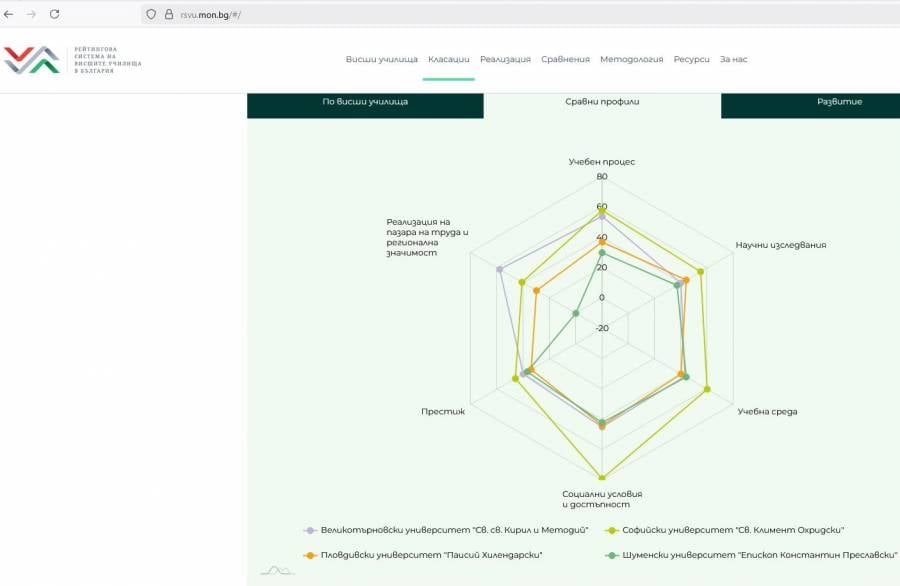 Системата предлага различни варианти за визуализация на данните, което помага на потребителите да сравняват профилите на различни ВУЗ-ове и да се ориентират кое ги издига в класацията.