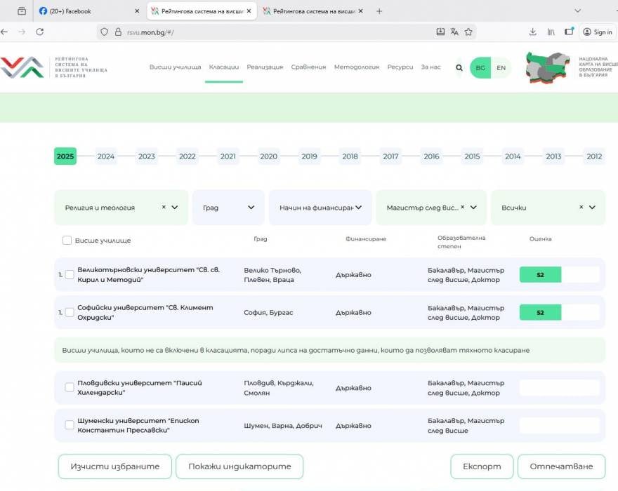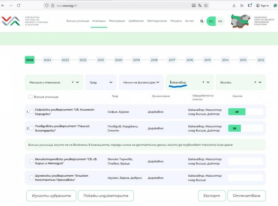 За 2025 г. в професионално направление Религия и теология за поредна година безспорен лидер е Богословският факултет на Софийския университет „Св. Климент Охридски". Той има 51 точки от 100. В общата класация той дели първото място заедно с Православния Богословски факултет на Великотърновския университет "Св. Кирил и Методий", който също е с 51 точки. Разликата е в това, че Богословският факултет на СУ осигурява обучение във всички образователни степени - бакалавър, магистър и доктор. Православният Богословски факултет във Велико Търново тази година отбеляза значителен успех, като се издигна от второ място до първото, което споделя с БФ на СУ.