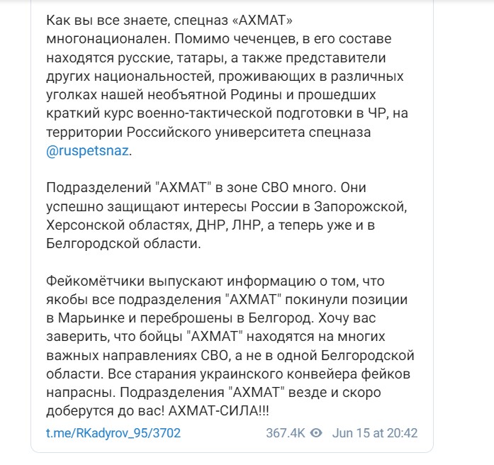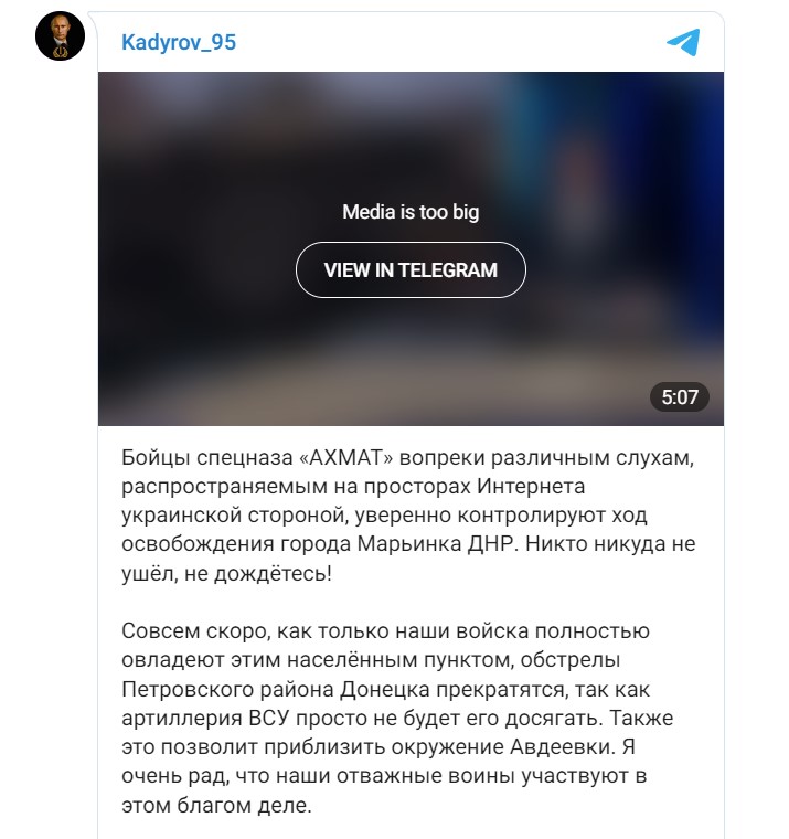 „Бойците от специалните части "АХМАТ", противно на различни слухове, разпространявани в интернет от украинска страна, уверено контролират хода на освобождаването на град Маринка в ДНР. Никой не остана, не чакайте! Много скоро, веднага щом нашите войски напълно превземат това населено място, обстрелът на Петровски район на Донецк ще спре, тъй като артилерията на въоръжените сили на Украйна просто няма да го достигне. Освен това това ще доближи средата на Авдиевка. Много се радвам, че нашите смели воини участват в тази добра кауза", написа още Кадиров.
