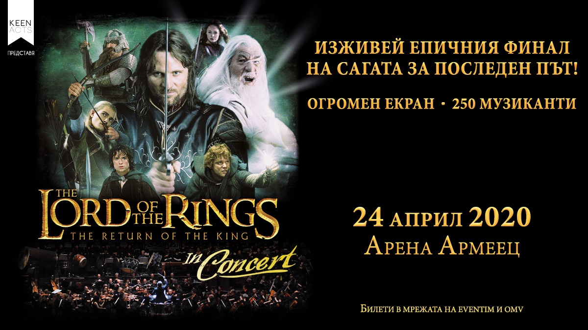 /КРОСС/ Мащабната продукция Lord of The Rings In Concert ще гостува у нас за големия финал на сагата през пролетта на следващата година. Технически и логистични причини възпрепятстват навременното идване на международния екип и техниката нужна за шоуто в средата на ноември. Новата, потвърдена от екипа на Хауърд Шор дата, е 24 април 2020 г., когато 30-членният международен екип ще се завърне в Европа за обновения график на турнето.