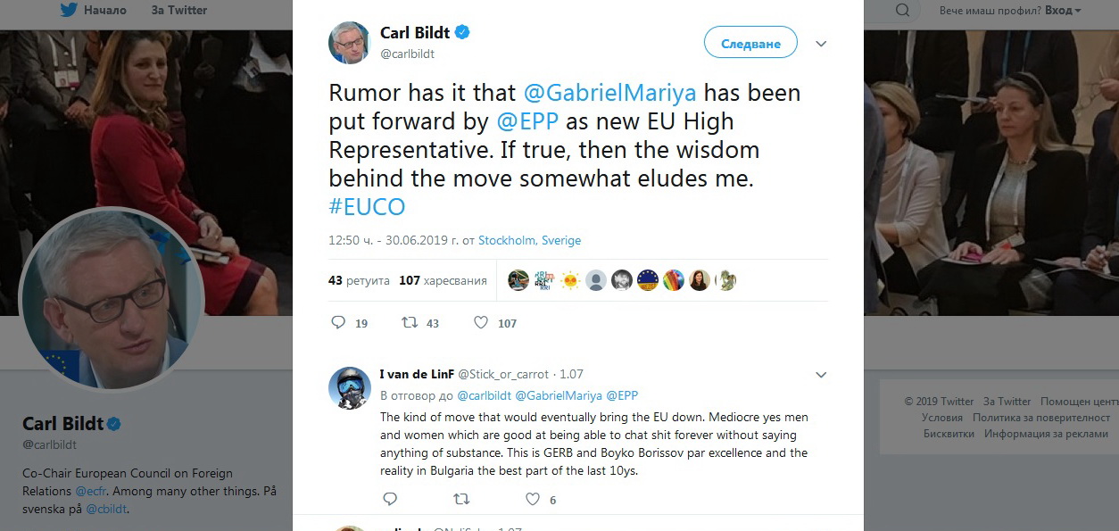 "Слухът е, че Мария Габриел е предложена от ЕНП (Европейската народна партия - б.р.) като върховен представител на ЕС. Ако е истина, мъдростта зад този ход ми убягва", написа в Туитър Билдт (70 г.), който е смятан за един авторитетите от тежка категория в световната дипломация.