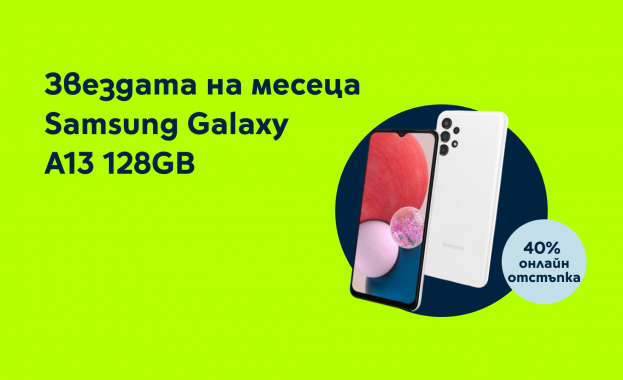 /КРОСС/ Този месец „звездата“ в онлайн магазина на Yettel се нарича SAMSUNG Galaxy A13. Смартфонът се предлага с цели 40% отстъпка от цената в брой или на лизинг, при покупка с абонамент Тотал + 25.99 или по-висок и договор за две години.