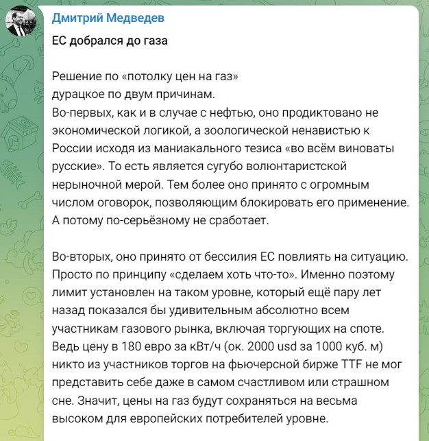 В петък той публикува коментар в канала си в Telegram за въвеждането на таван на цените на газа от ЕС, като нарече подобно решение "глупаво". „Както в случая с петрола, това не е продиктувано от икономическа логика, а от зоологическа омраза към Русия, основана на маниакалната теза „Руснаците са виновни за всичко". Тоест това е чисто волюнтаристична непазарна мярка", написа Медведев.