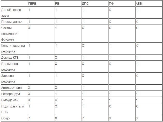 По отношение на позиционирането на отделните играчи в таблицата по-долу са включени най-емблематичните политики и въпроси, които са изисквали парламентарно гласуване. Единица получават партиите, които са успели да наложат предпочитанията си на останалите (на тези, които са изпаднали в малцинство или са гласували против първоначално заявените си позиции). Тази таблица, разбира се, опростява значително по-нюансираната реалност, но дори от нея е видно, че по ключово важни въпроси ДПС се е оказало в по-изгодна позиция от формалните коалицонни партньори на ГЕРБ. Дори да отчетем развитието около конституционната реформа като еднозначен успех на РБ (което е малко пресилено), дори да сложим в тази категория и блокирането на първоначалните идеи за частните пенсионни фондове на министър Горанов, отново ДПС завършва сезона малко по-напред от основния коалиционен партньор на ГЕРБ - реформаторите.