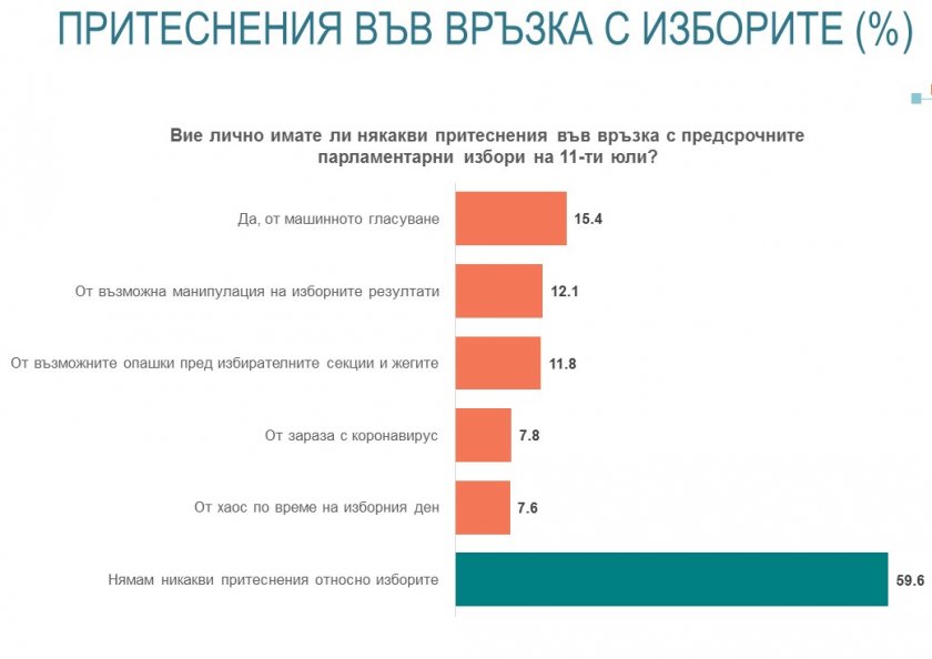 Мобилизиращ фактор е желанието на всяка от двете основни групи избиратели – от една страна, симпатизантите на ГЕРБ, от друга, на протестните партии – с вота си да определят посоката на развитие на страната и да излъчат правителство около техните политически сили. В противоположна посока действат притесненията от машинното гласуване, които могат да се превърнат в потенциална бариера пред част от избирателите. 15.4% от всички анкетирани заявяват, че имат притеснения от машинното гласуване, а 11.8% от възможни опашки пред изборните секции в резултат от по-бавното гласуване. Най-сериозно отражение би имал новият начин на гласуване върху избирателите на БСП, от които всеки четвърти и на ДПС, от които всеки трети изразява безпокойство от този вот. 12 на сто имат съмнения за манипулация на изборните резултати. Значително са намалели притесненията от зараза с коронавирус – 7.8%. Както и на предишните избори, възможни са по-големи амплитуди на избирателната активност, не на последно място, и заради разширените възможности на вота от чужбина.