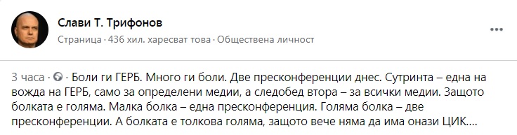 "Боли ги ГЕРБ. Много ги боли. Две пресконференции днес. Сутринта - една на вожда на ГЕРБ, само за определени медии, а следобед втора - за всички медии.