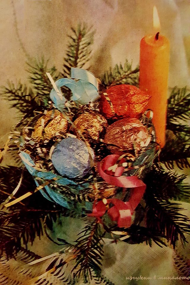 Това е картичка от 1977г., на която се вижда една от популярните традиционни за 70-те и 80-те години сурвачки, украсени разклонени и извити пръчки с бяла и синя хартия - обикновена или разтегателна, и с хартиени гирлянди. В по-късни варианти се нанизваха и пуканки, които се използваха да се увиват около стъблото вместо гирляндите, пишат от "Изгубени в миналото".