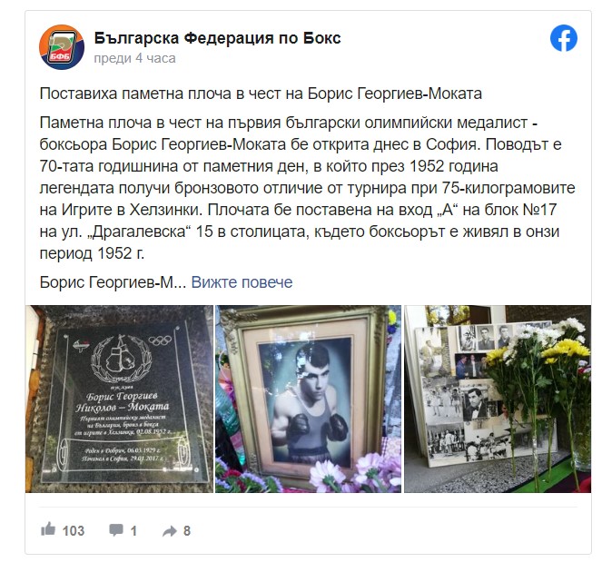 /КРОСС/ Паметна плоча в чест на първия български олимпийски медалист - боксьора Борис Георгиев-Моката - бе открита днес в София. Поводът е 70-ата годишнина от деня, в който през 1952 година легендата получи бронзовото отличие от турнира при 75-килограмовите на Игрите в Хелзинки, съобщи "Труд бг".