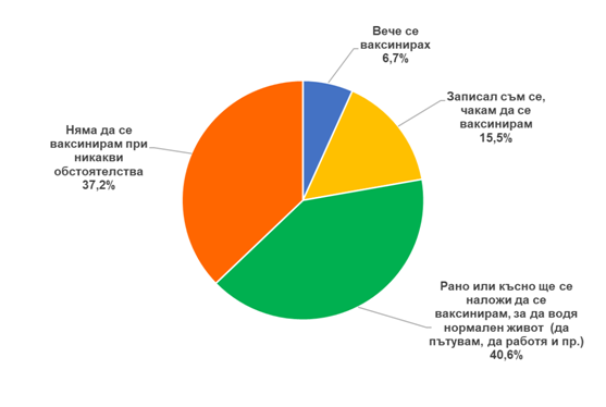 Делът на заявяващите, че няма да се ваксинират при никакви обстоятелства, възлиза на 37,2%, като подобна позиция по-често се среща сред хора на възраст под 40 години и сред жители на малките градове и села в страната.
