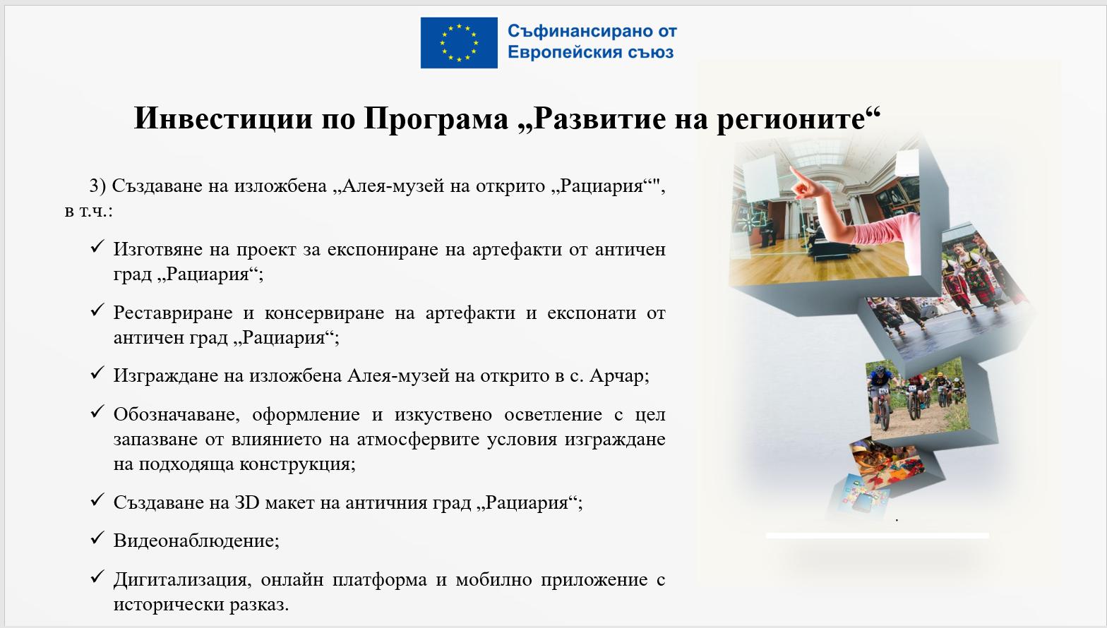 Договорът за проекта е подписан на 27.11.2025 г. и в рамките на три години трябва да се реализират мерки за съхранение и експониране на културното и историческо наследство с цел привличане на туристи и създаване на устойчиви форми на туризъм: Изграждане на изложбена Алея-музей на открито в с. Арчар; Реставриране и консервиране на музейни експонати от античен град Рациария; Създаване на 3D макет на античен град Рациария; Онлайн платформа и мобилно приложение с исторически разказ за античен град Рациария.