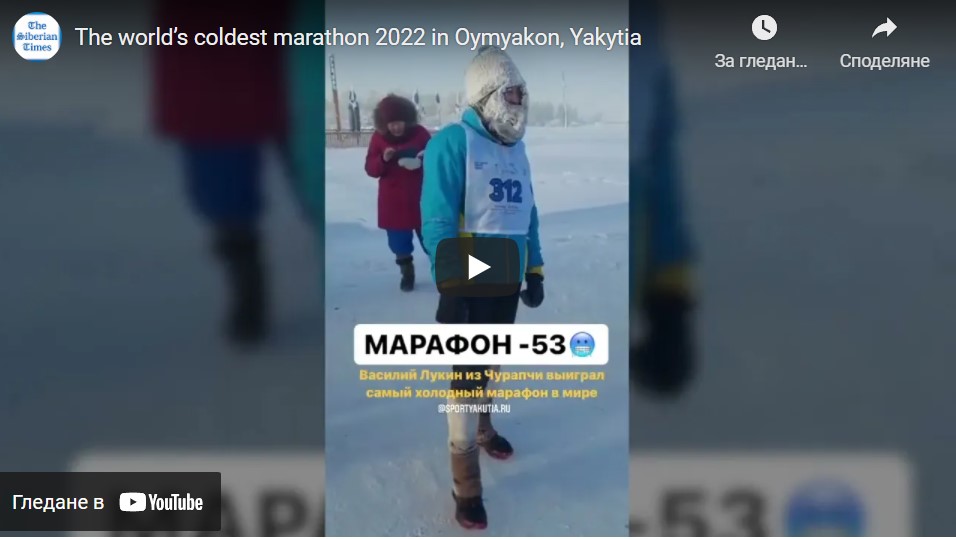 /КРОСС/ Маратон в Сибир постави рекорд на Гинес за бягане при минусови температури от 63,4 градуса под нулата, пише UPI. Организаторите на "Полюс на студа", който традиционно се провежда в руската републикa Якутия, съобщиха, че състезанието е започнало при с прогноза живакът в термометрите да падне до минус 76 градуса.