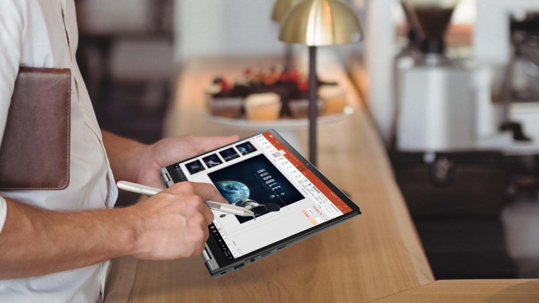 Лаптопът идва и с електронна писалка модел Wacom AES 2.0 Pen с 4,096 нива на натиск, което прави процесите на писане и рисуване естествени и прецизни. Моделът 2-in-1 също така има и защита срещу изпускане и надраскване на диспеля. Новата примиум IPS дисплей технология гарантира невероятно качество на картината от всеки възможен ъгъл. С голямата си батерия от 72W, лаптопът може да работи повече от 21 часа.