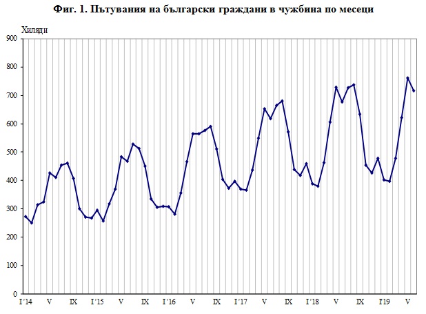 /КРОСС/ Пътуванията на български граждани в чужбина през юни 2019 г. са 717.1 хил. или с 5.9% над регистрираните през юни 2018 година (фиг.1). Увеличение на пътуванията на български граждани в сравнение със същия месец на предходната година е отчетено към: Турция - с 15.4%, Румъния - със 7.8%, Гърция - с 6.2%, Германия - с 5.1%, Австрия - с 3.0%, Република Северна Македония - с 2.9%, Италия - с 2.7%, Испания - с 1.8%, и други. Същевременно намаляват пътуванията на български граждани към: Белгия - със 7.9%, Сърбия - с 1.9%, Руската федерация - с 0.8%, и други.