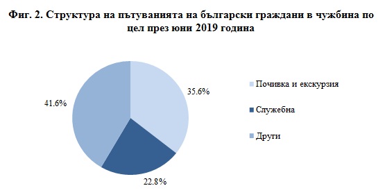 В сравнение с юни 2018 г. e регистрирано увеличение по всички наблюдавани цели: „други" - със 7.5%, „почивка и екскурзия" - с 6.0%, и „служебна" - с 2.7%. Най-голям относителен дял от общия брой пътувания на български граждани в чужбина през юни 2019 г. формират пътуванията с други цели (гостуване, обучение, посещение на културни и спортни мероприятия) - 41.6%, следвани от тези с цел почивка и екскурзия - 35.6%, и със служебна цел - 22.8% (фиг. 2).