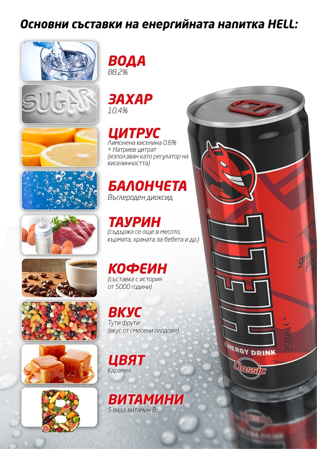 HELL е източник и на така наречената положителна енергия, от която организмът се нуждае след тежко физическо натоварване, например, или при по-активна мозъчна дейност. Енергийните напитки HELL съдържат 88,2% вода, а в останалите близо 12% най-важната съставка е захарта (с изключение на продукта ZERO, в който няма захар), която осигурява на потребителите енергия и която други производители заменят с подсладители или изоглюкози като по-евтин вариант.