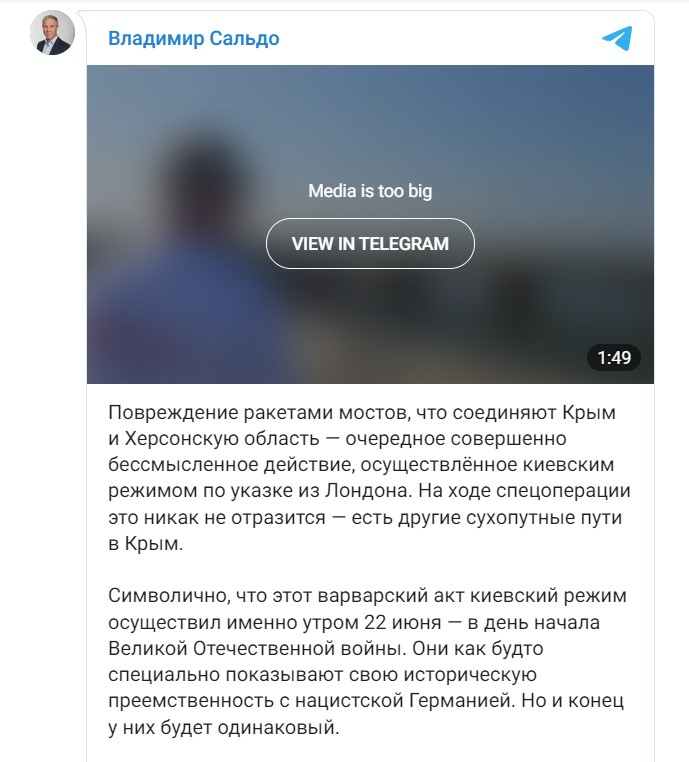 Ръководителят на назначените от Москва окупационни власти в Херсонска област Владимир Салдо съобщи, че силите на Киев са "бомбардирали цивилна инфраструктура: мостове на административната граница между Херсонска област и Крим, близо до Чонгар". Той публикува снимки, на които се вижда кратер в пътната настилка на моста. По думите му първоначалното разследване показва, че украинците са използвали британски ракети "Сторм Шадоус", информира БТА.