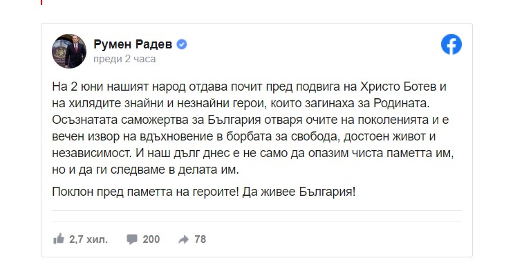 /КРОСС/ На 2 юни нашият народ отдава почит пред подвига на Христо Ботев и на хилядите знайни и незнайни герои, които загинаха за Родината. Осъзнатата саможертва за България отваря очите на поколенията и е вечен извор на вдъхновение в борбата за свобода, достоен живот и независимост. Това написа в профила си във Фейсбук президентът Румен Радев по повод 2 юни - Деня на Христо Ботев и на загиналите за свободата и независимостта на България.