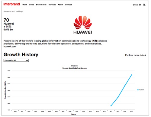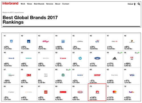 За трета поредна година Huawei се изкачва в класацията на Interbrand след историческия си дебют през 2014 година като първият китайски бранд, който присъства в престижната глобална класация.