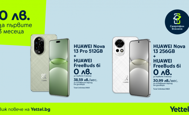 Сред актуалните предложения при смартфоните са HONOR 200 Lite 5G 256GB, HUAWEI Nova 13 256GB с безжични слушалки FreeBuds 6i, HUAWEI Nova 13 Pro 512GB с безжични слушалки FreeBuds 6i и XIAOMI Redmi Note 14 Pro+ 5G 512GB с XIAOMI Smart Band 9 Active.