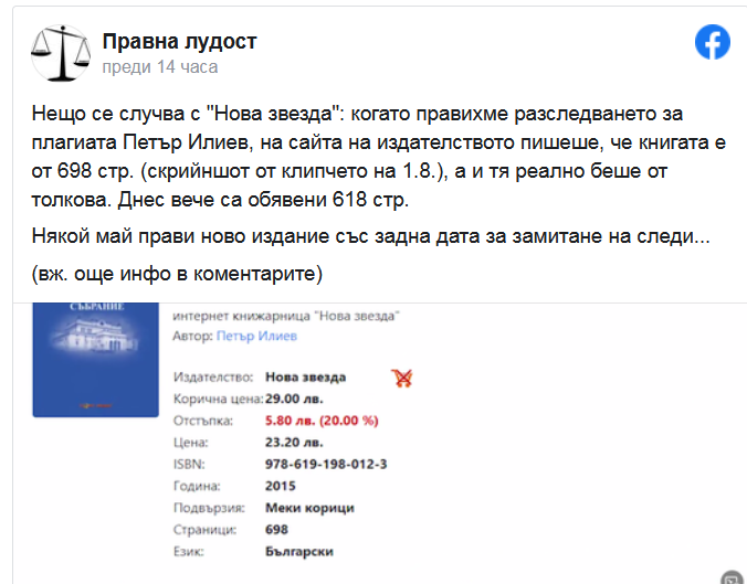 „Нещо се случва с „Нова звезда": когато правихме разследването, на сайта пишеше, че книгата е от 698 стр. (скрийншот от клипчето на 1.8.), а и тя реално беше от толкова. Днес вече са обявени 618 стр. Някой май прави ново издание със задна дата за замитане на следи...", пишат те.