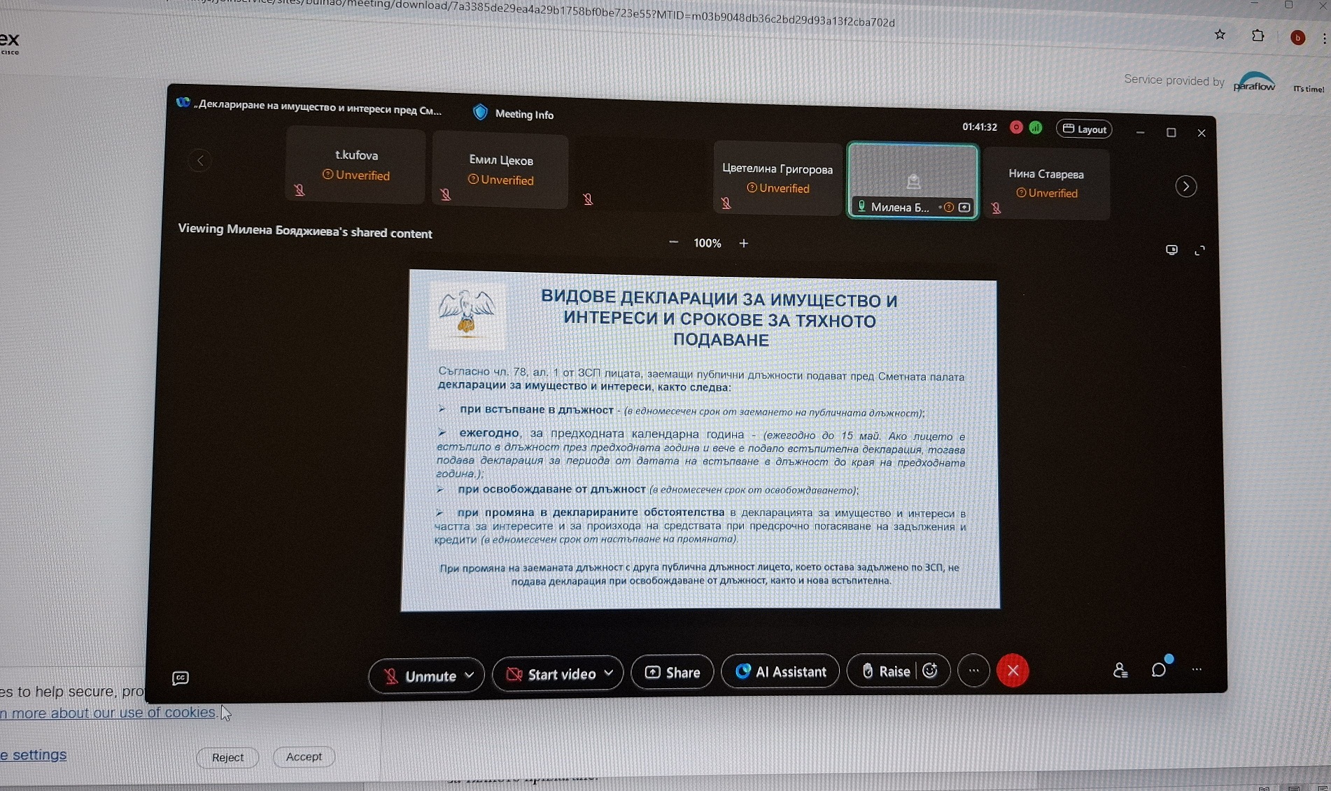 Предстоят още обучения и за други групи от задължените лица по Закона за Сметната палата, като през следващата седмица ще се проведе онлайн среща за директорите на училища и детски градини.