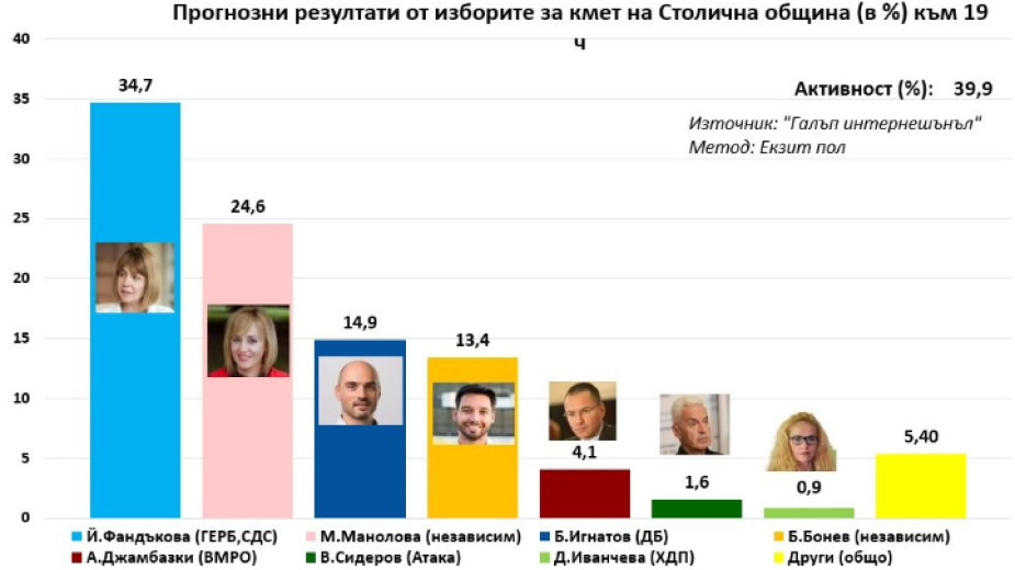 действащият кмет Йорданка Фандъкова (ГЕРБ) получава 34,7 % от гласовете срещу 24,6 за независимата кандидатка, подкрепена от БСП, Мая Манолова. Борислав Игнатов от „Демократична България“ е с около 15 на сто, а независимият кандидат Борис Бонев е с около 13. Ангел Джамбазки от ВМРО има 4,1 %.