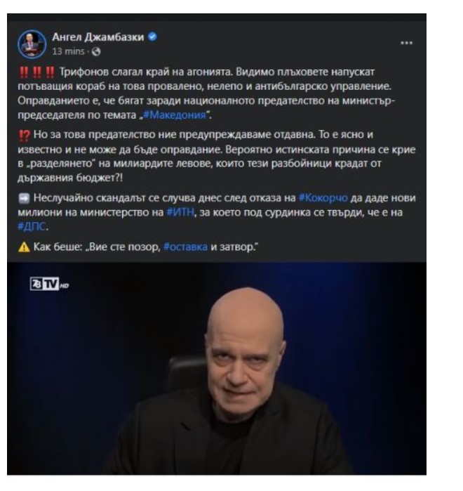 "Но за това предателство ние предупреждаваме отдавна. То е ясно и известно и не може да бъде оправдание. Вероятно истинската причина се крие в „разделянето“ на милиардите левове, които тези разбойници крадат от държавния бюджет", посочва Джамбазки.