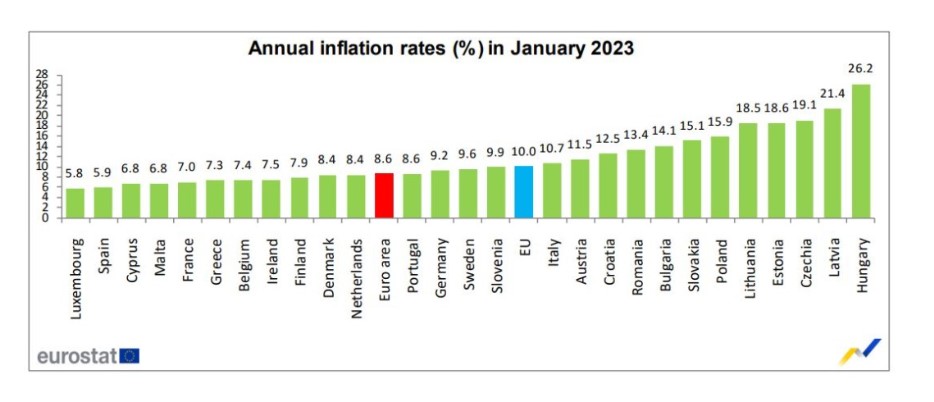 Най-ниска годишна инфлация през януари беше отчетен в Люксембург (5,8%), следван от Испания (5,9%), Кипър и Малта (и двете с инфлация от по 6,8%), докато най-висока инфлация беше отчетена в Унгария (26,2%), Латвия (21,4%) и Чехия (19,1%).